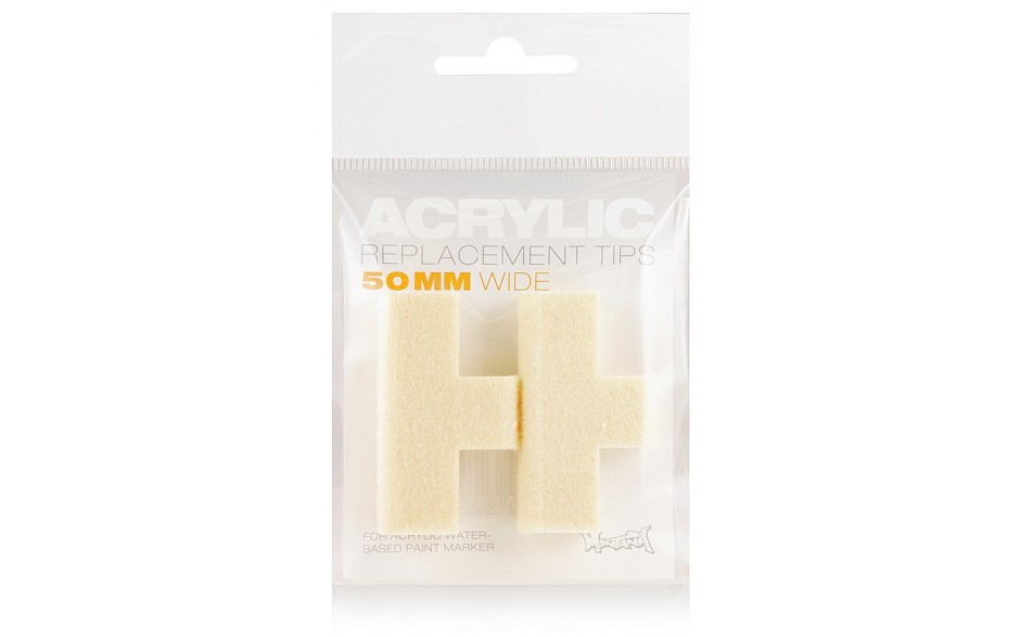 Puntas de repuesto Tip Set 50mm. La punta de recambio Montana ACRYLIC 50mm es una punta ancha de alta calidad, ideal para trabajos grandes y líneas anchas. La punta está hecha de fieltro de fibra natural para un resultado limpio y fácil. Adecuado en el marcador Montana ACRYLIC 50mm. La punta de 50mm se suministra en paquete de 2 piezas.