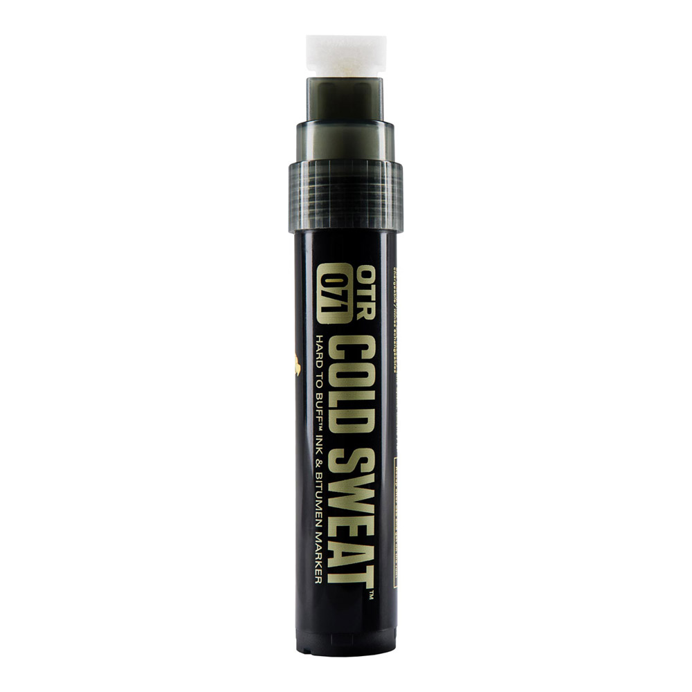 OTR 071 COLD SWEAT. ¡Este marcador mancha! El OTR.071 está lleno con una mezcla ingeniosa de tinta hard to buff y de betún. Sí, lo has leído correctamente, ¡nuestra tinta ultrapermanente y altamente pigmentada junto con el betún viscoso negro! El hermano mayor del cold sweat otr 171, con depósito más grande y mas pintura.Solo el OTR.071 COLD SWEAT permite estos recubrimientos completamente opacos y gruesos mediante el marcador de acción.